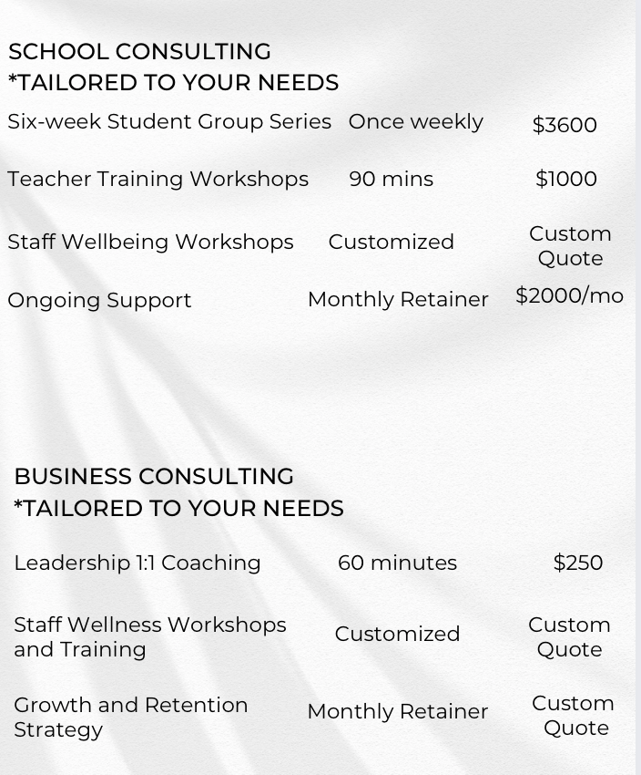 Whether you're an individual navigating a transition, a couple rebuilding trust, a team leader supporting staff wellness, or a school in need of trauma-informed tools—there’s a space for you here. These packages are designed to offer structured support, skill-building, and space for real growth.
